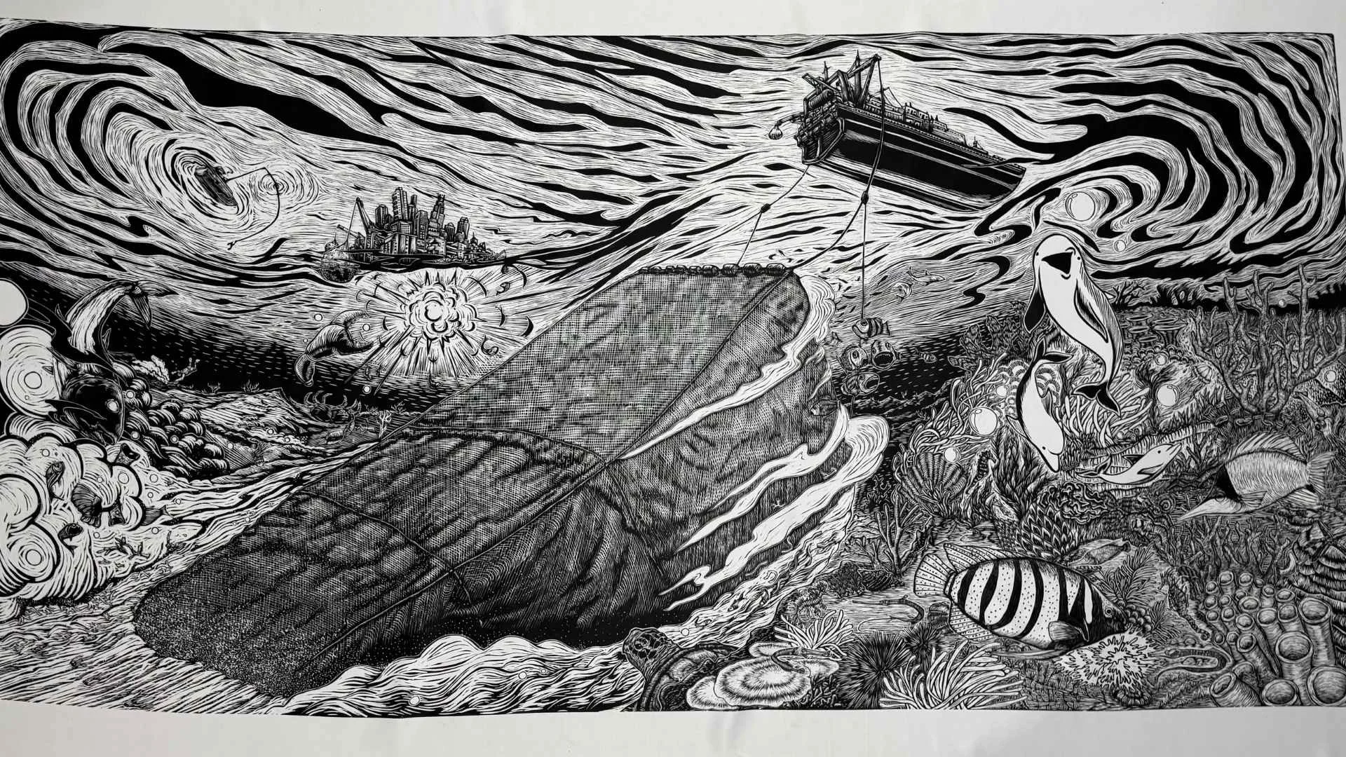 This work portrays the ocean as a wounded soul—beautiful, yet burdened by pollution, overfishing, and human greed. Lament of the Ocean invites us to hear the whispers of the deep, reminding us to see the sea not merely as a resource, but as life itself.” – Pangrok Sulap